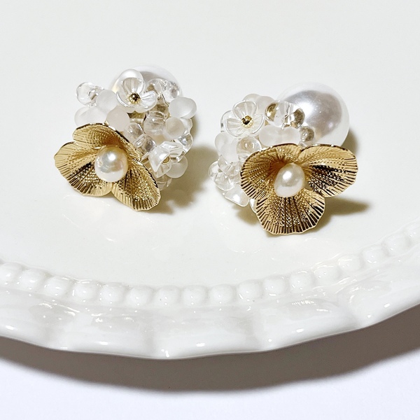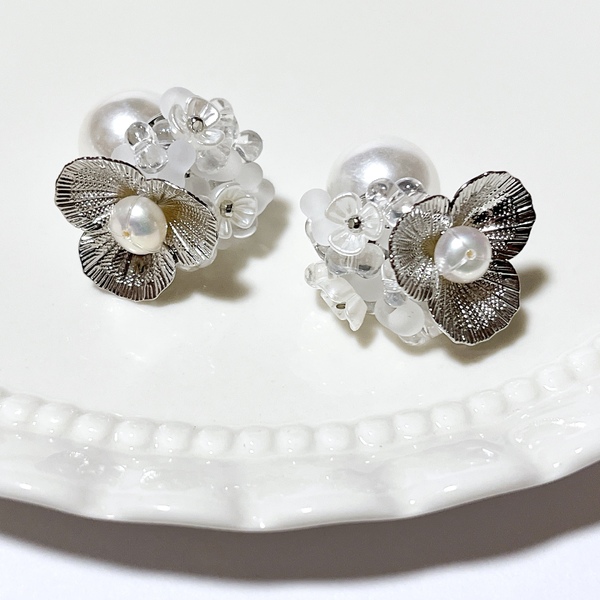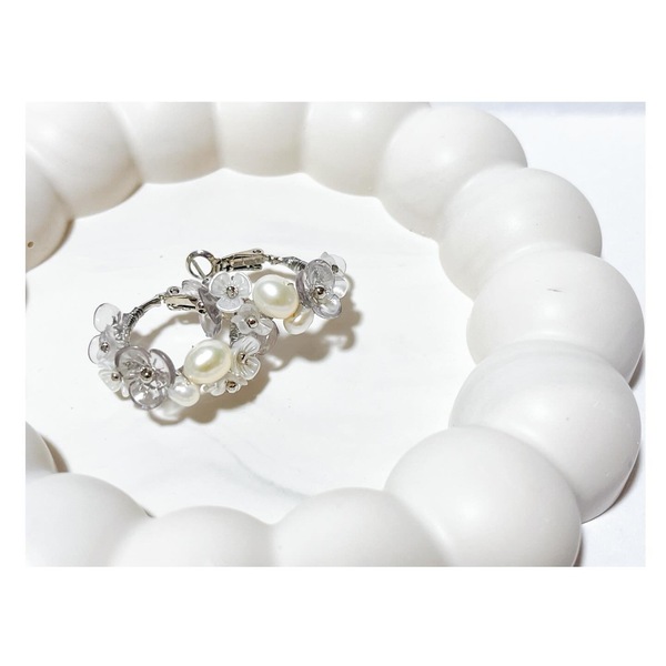 淡水パールとお花のClassic hoop pierce ~モノクロ~