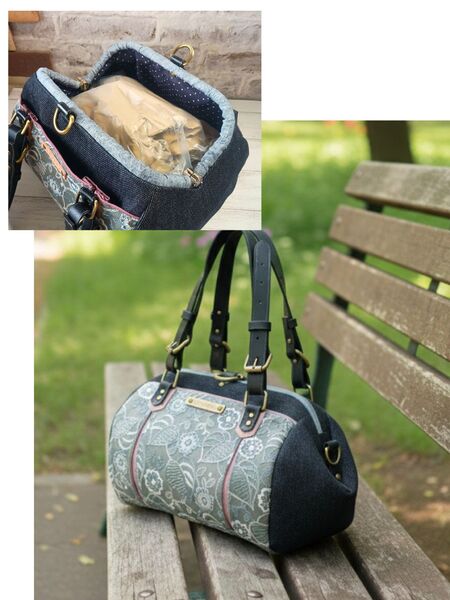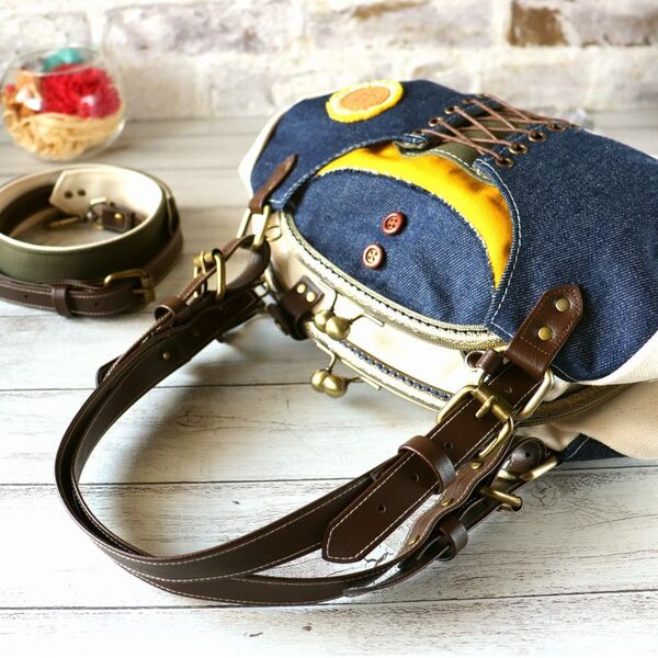 Poccia【藍の音ainone】大きな口のボストンバッグ/デニム&花刺繍