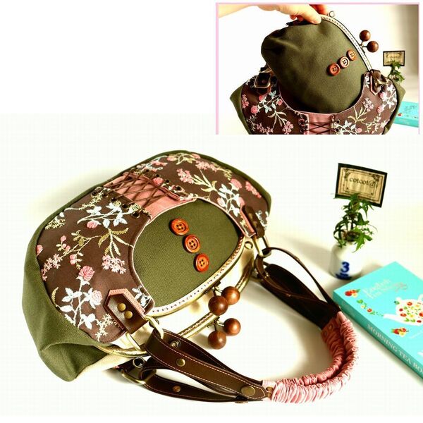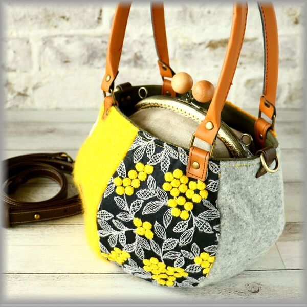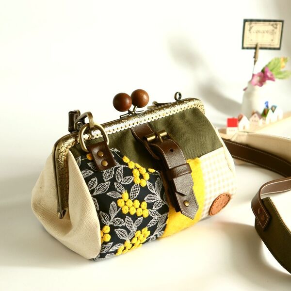 "がま口ミニボストン”イタリアンモヘヤウール&木の実刺繍&帆布”