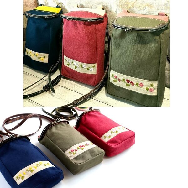 スマホポーチ【糸の音itonone】3色帆布&花の手刺繍