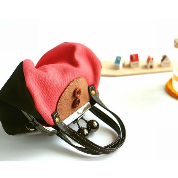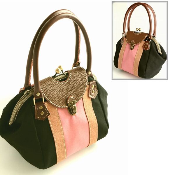 バイカラーフラップ付きがま口帆布2WAY ブラック&桃色 Lサイズ