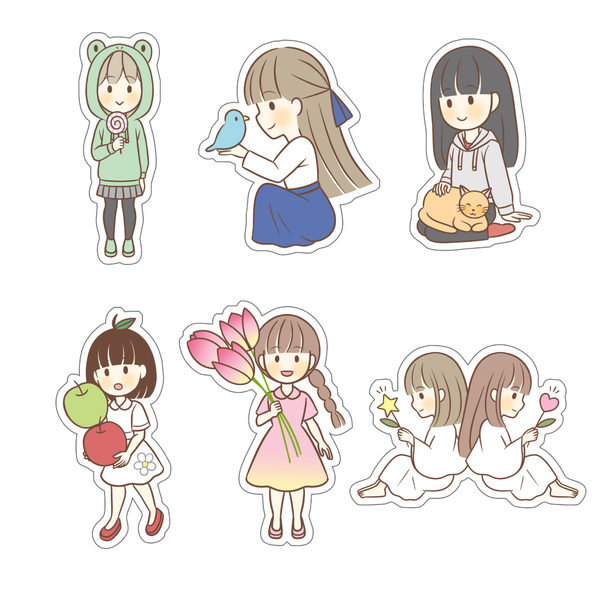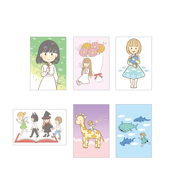 女の子を中心に、やわらかい雰囲気のゆるいイラストを描いています。モチーフは女の子と動物、女の子と植物などが多く、線や色合いもやわらかめのものを用いることが多いです。制作したイラストをもとに、ポストカード、ステッカー、クリアファイルなどのグッズを販売しています。