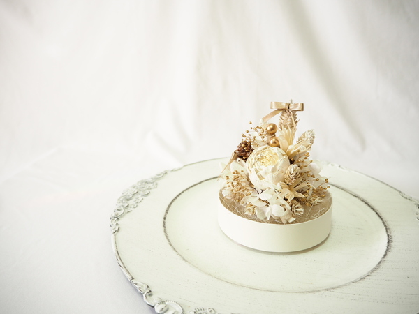 漆喰で作られた花をアーティフィシャルフラワーやプリザーブドフラワーと一緒に合わせてアレンジをしています。漆喰の花の色合いは優しく、見た目はまるで和菓子の落雁ようです。部屋に飾ると空間が華やかになり、漆喰の花にお好きな香りのアロマオイルを垂らすとデュフューザーとして香りを楽しむことができる一石二鳥な商品を販売します。イチオシはバレエシューズを花器として使用したアレンジメントです。